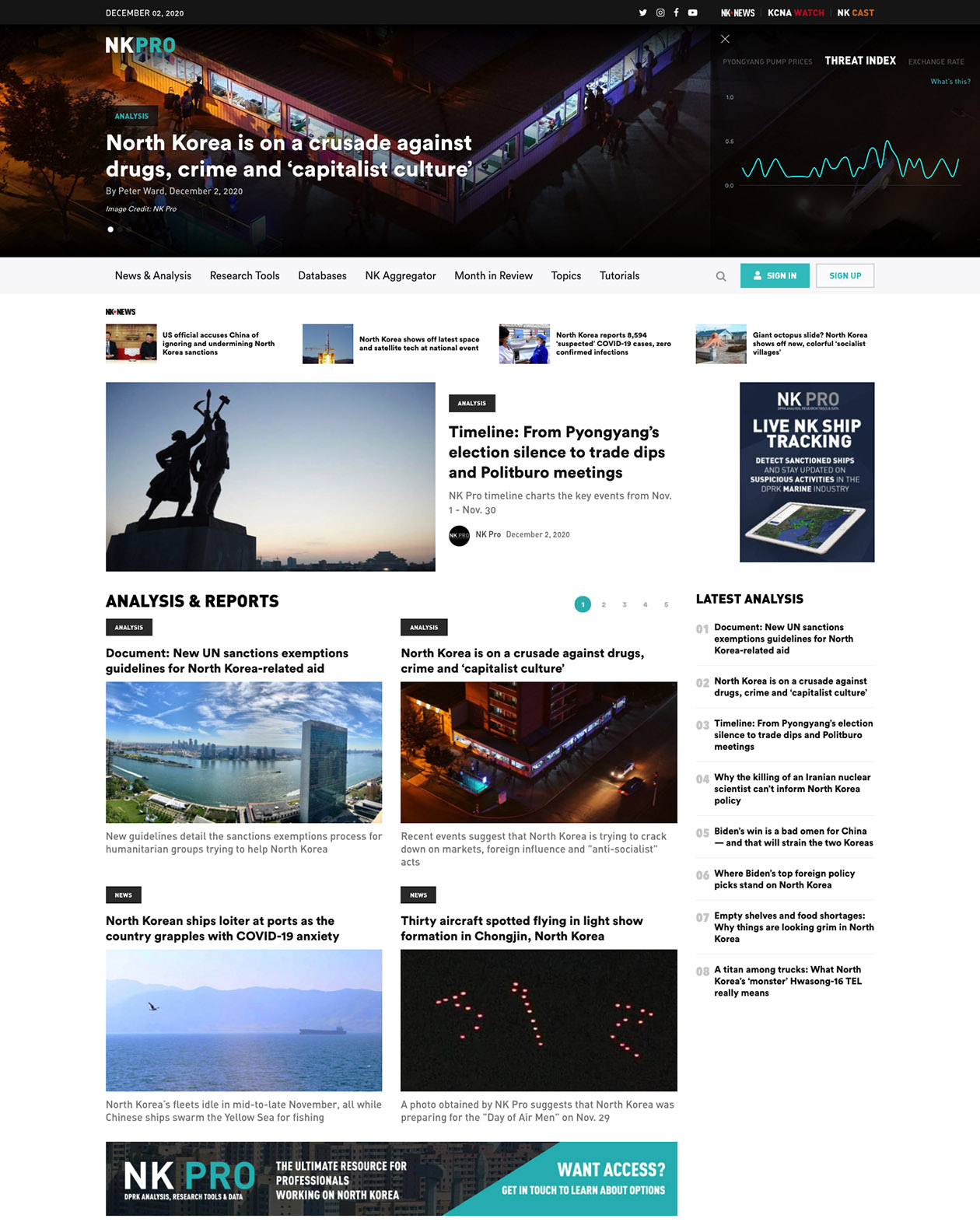 NK PRO and KOREA PRO are professional research platforms that are part of a larger network of sites, including NK News and KCNA Watch.